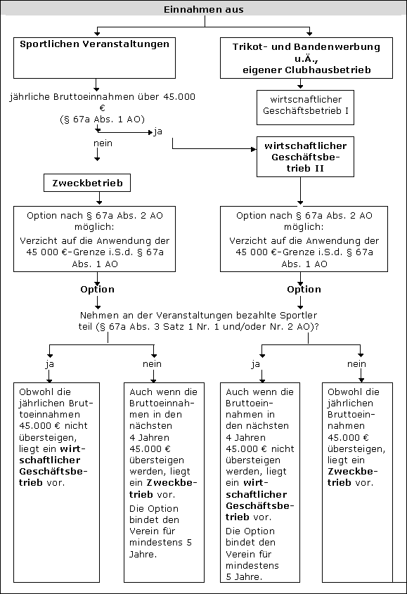 … § 67a AO: Sportliche Veranstaltungen Wurde die Zweckbetriebsgrenze überschritten oder auf deren Anwendung nach § 67a Abs. 3 Satz 1 AO verzichtet, liegt ein wirtschaftlicher Geschäftsbetrieb vor, wenn bezahlte Sportler teilnehmen. Die Leistungen sind nicht nach § 12 Abs. 2 Nr. 8 Buchst. a UStG begünstigt. |