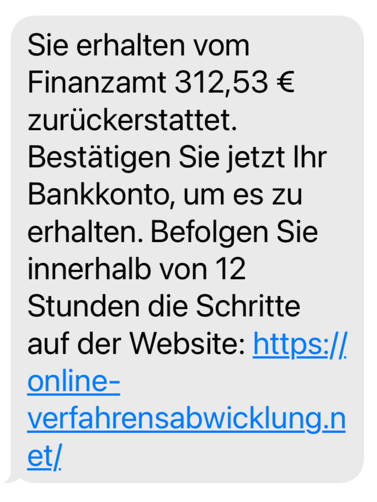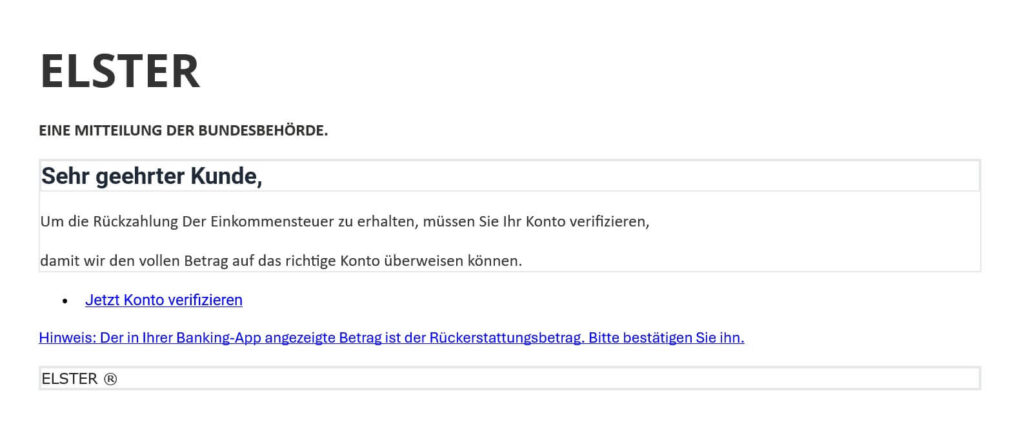 Gefälschte SMS informieren Dich zum Beispiel darüber, dass Deine Bankverbindung benötigt wird, um Deine Steuererstattung auszuzahlen. Die Eingabe ist angeblich über die verlinkte Internetseite möglich. Klicke niemals diesen Links.